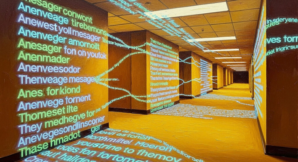 無限に続くカーペットの廊下は、出口のないオフィス空間のような迷路です。